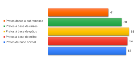 No que diz respeito ao consumo da gastronomia paraibana, todos os respondentes já haviam consumido algum prato da culinária regional; dentre eles, 55,4% dos respondentes disseram ter levado a gastronomia em consideração ao escolher visitar o estado. Com relação aos elementos que impulsionaram o consumo desses alimentos, os respondentes destacaram aspectos como os variados sabores presentes nos pratos, os ingredientes e temperos utilizados, além das particularidades da região e da cultura associadas ao modo de preparo dos pratos. No que tange aos pratos mais consumidos pelos turistas, predominou o consumo de pratos cujas receitas fazem uso da carne animal, de raízes e de grãos, conforme apontado por Mello (2002) quanto aos principais ingredientes presentes nas receitas paraibanas. A Figura 2 apresenta o consumo de cada tipo de prato: