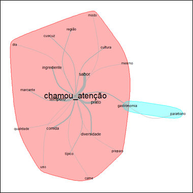 No que se refere aos elementos da gastronomia que chamaram a atenção do turista, ganharam destaque na percepção do respondente: o sabor da comida, os pratos típicos, os temperos e ingredientes utilizados nas receitas, bem como a diversidade dos pratos, a qualidade e o preparo dos alimentos. Ademais, ressaltaram também a presença de elementos que derivam das influências de outras culturas que se enraizaram na gastronomia paraibana, como apontado por um respondente: “O tempero marcante é extremamente saboroso: carrega em si a influência gastronômica africana, europeia e indiana”; a perspectiva trazida por esse turista vai ao encontro do que é colocado por Tomazoni (2022) em relação à influência dessas culturas no processo de construção da gastronomia nordestina, que resultou em pratos que mesclam ingredientes provenientes desses diferentes grupos. Outrossim, foi citada também a diversidade dos pratos paraibanos no que tange ao preparo de diferentes receitas que compartilham ingredientes semelhantes, especialmente no uso do milho em variados pratos e a forte presença da carne animal nas receitas. A visão dos respondentes aponta para a ideia de Campos et al. (2009) quanto a capacidade da gastronomia paraibana de ofertar uma variada combinação de sabores dentre os pratos típicos do estado. A seguinte Análise de Similitude demonstra a ligação entre as principais expressões citadas pelos turistas para determinar os elementos da gastronomia que mais chamaram a atenção na sua experiência gastronômica: