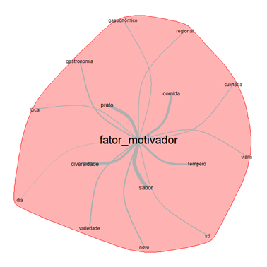 Investigando acerca de novas possíveis visitações por parte desse grupo e das suas possíveis motivações, os resultados encontrados apontaram que 92,3% dos respondentes consideravam a gastronomia do estado capaz de impulsionar uma nova visita , tendo como finalidade conhecê-la melhor. Para entender melhor a percepção dos indivíduos sobre a possibilidade de uma nova visita, foram questionado quais aspectos da gastronomia seriam responsáveis por motivar o novo deslocamento ao estado. Os respondentes destacaram a diversidade da gastronomia paraibana e os temperos e sabores presentes nos diferentes pratos que compõem tal culinária, como citado pelo seguinte turista: “. . . a diversidade dos pratos e os locais sem dúvidas serão pontos fortes de uma nova visita!”. Outros respondentes destacaram ainda que uma única viagem era insuficiente para conseguir degustar as diferentes receitas ofertadas pelo estado, aspectos que abrem espaço à expectativa de novas visitas por parte desses indivíduos. O destaque dado pelos turistas aos temperos e ingredientes presentes nos pratos mantém relação com a figura do terroir da região, particularizando os aspectos naturais e imprimindo um diferencial nos produtos gastronômicos desenvolvidos na região, como colocado por Silva e Maracajá (2021); havendo assim uma associação entre o ambiente visitado e determinados alimentos e receitas (Barroco, Barroco, 2008; Landa, 2018). A representação visual dos fatores gastronômicos que motivariam o retorno dos turistas ao estado pode ser percebida através da Análise de Similitude a seguir, onde são apresentadas as conexões resultantes das opiniões emitidas pelos respondentes: