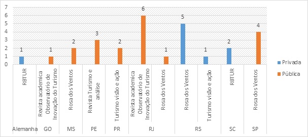 A partir da análise dos artigos, observa-se na figura 2 que os autores que mais publicam sobre turismo e ODS são de instituições públicas situadas no estado do Rio de Janeiro (RJ), seguido de instituições privadas localizadas no Rio Grande do Sul (RS). O periódico que mais publicou pesquisas com a temática ODS e Turismo foi o periódico Rosa dos Ventos, classificado com Qualis B2 na área de Administração Pública e de Empresas, Ciências Contábeis e Turismo. Apenas o periódico Caderno Virtual de Turismo, dos seis periódicos analisados, não obteve nenhuma publicação com enfoque nesta temática no período de recorte da pesquisa.