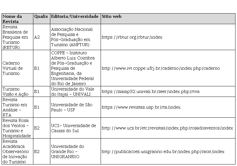 Com relação às produções acadêmicas, foram utilizados os termos “ODS”, “Objetivos do Desenvolvimento Sustentável” e “Agenda 2030” nos principais periódicos brasileiros da área de Turismo. Primeiro, identificaram-se as revistas acadêmicas especializadas em Turismo no Brasil, publicadas em português e atualmente classificadas no Qualis como B2, B1 e A2, apresentadas no Quadro 1. O Qualis é o sistema que a Coordenação de Aperfeiçoamento de Pessoal de Nível Superior (CAPES), vinculada ao Ministério da Educação do Brasil, utiliza para classificar os periódicos científicos que publicam trabalhos da pós-graduação. O sistema Qualis é dividido em A1, A2, B1, B2, B3, B4 e B5, sendo A1 as revistas mais relevantes . Contudo, destaca-se que não há revistas nacionais classificadas como A1 na área do turismo. Além disso, não foram consideradas nesta pesquisa as revistas em turismo pertencentes aos estratos B3 a B5, visto que o impacto destas revistas na produção nacional é pouco relevante.