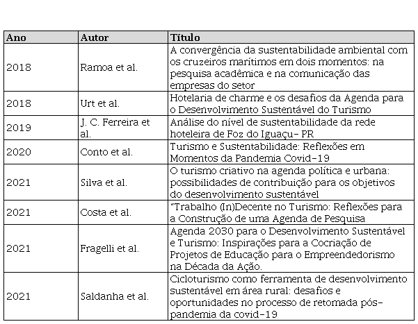 De Conto et al. (2020) apresentam considerações a partir de temas de pesquisa desenvolvidos no Programa de Pós-Graduação em Turismo e Hospitalidade da Universidade de Caxias do Sul e suas interfaces com a sustentabilidade e a pandemia de covid-19. Da mesma forma que o artigo de J. C. Ferreira et al. (2019), não há um debate profundo sobre a Agenda 2030, tão somente é mencionada, mostrando a sua importância para um turismo sustentável.