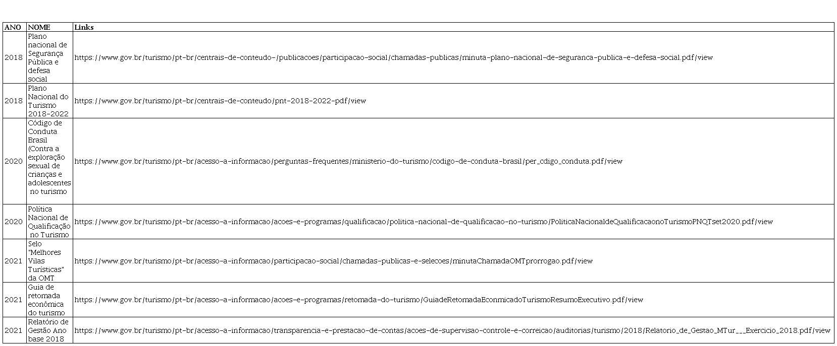 Ministério do Turismo (2018). Minuta Plano Nacional de Segurança Pública e Defesa Social. Disponível em: https://www.gov.br/turismo/pt-br/centrais-de-conteudo-/publicacoes/participacao-social/chamadas-publicas/minuta-plano-nacional-de-seguranca-publica-e-defesa-social.pdf/view