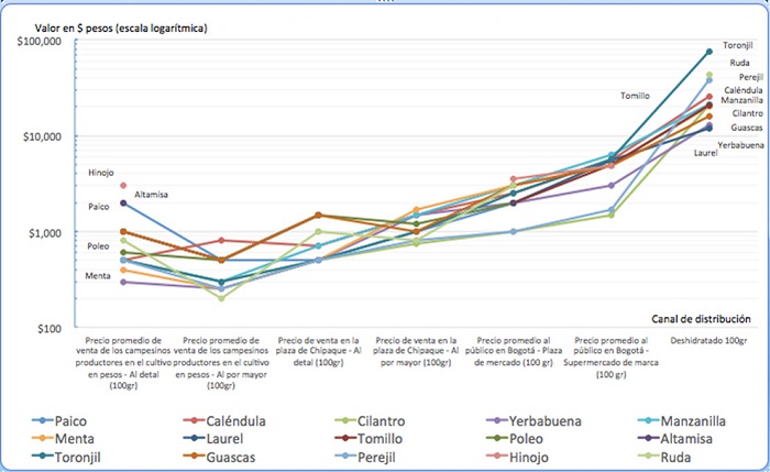Se puede observar que la tendencia es que el precio promedio de venta de las plantas tradicionales al detal en el cultivo es relativamente alto y que luego este se reduce cuando se venden al por mayor. La única excepción es la caléndula, la cual incrementa su precio en el cultivo al por mayor en comparación con la venta al detal. Luego, a medida que las plantas transitan por los diferentes lugares y procesos de distribución (plaza de mercado de Chipaque, plaza de mercado Samper Mendoza, supermercado en Bogotá y proceso de deshidratado), su precio sube sustancialmente. Asimismo, se evidencia que el precio de venta de las plantas en la plaza de Chipaque, cuando estas se llevan a la plaza Samper Mendoza, se incrementa por el costo de transporte del producto. Luego, cuando las plantas llegan a los supermercados en Bogotá, estas se limpian y se empacan y se venden a un mayor precio. Asimismo, cuando las plantas son sometidas a un proceso de deshidratación, su precio se multiplica exponencialmente.