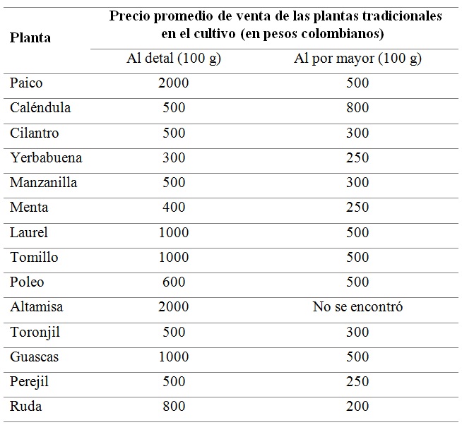 Cuando las plantas tradicionales llegan a Bogotá, su precio se incrementa significativamente, y esto se debe principalmente al transporte y al papel de los intermediarios. Por ejemplo, el precio de la ruda se incrementa en promedio un 73 %; el del toronjil sube un 60 %; el del paico y la manzanilla, un 50 %; el de la caléndula y el poleo, un 40 %; el del cilantro y la yerbabuena, un 25 %, y el del perejil, un 20 %. Claramente, en la ciudad hay una mayor demanda de estas plantas, teniendo en cuenta la cantidad de población, la oferta reducida y la facilidad de acceso a la información sobre sus propiedades y usos.