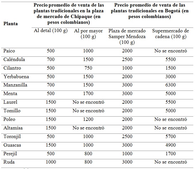 Dado que la mayoría de plantas tradicionales que se producen en Chipaque están dirigidas a los mercados de la ciudad de Bogotá, también se realizó un seguimiento de precios en dos lugares importantes: 1) la plaza de mercado Samper Mendoza, la cual es reconocida por la venta de plantas medicinales y mágico-religiosas provenientes de todo Colombia, y 2) diferentes supermercados de cadena ubicados en la zona norte de la ciudad. Los resultados se pueden apreciar en la tabla 3.