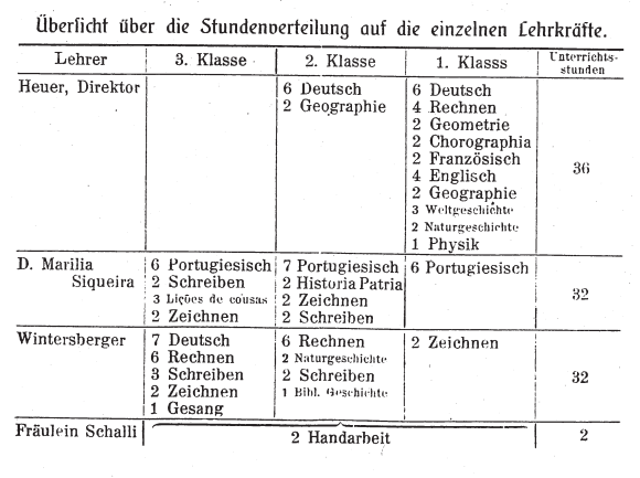 O professor Reinhard Heuer ministrava aulas em duas classes. Na primeira classe (7º. e 8º. ano), 6 horas de Alemão, 4 horas de Matemática, 2 horas de Geometria, 2 horas de Chorografia, 2 horas de Francês, 4 horas de Inglês, 2 horas de Geografia, 3 horas de História Geral, 2 horas de História Natural, 1 hora de Física. Na segunda classe (5º. e 6º. ano), lecionava 6 horas de Alemão e 2 horas de Geografia. A professora Marília Siqueira lecionava em três classes. Na primeira classe, 6 horas de Português. Na segunda classe, 7 horas de Português; 2 horas de História Pátria; 2 horas de Desenho; 2 horas de Escrita. Na terceira classe (3º. e 4º. ano), lecionava 6 horas de Português, 2 horas de Escrita, 3 horas de Lições de Coisas, 2 horas de Desenho. O professor Wintersberger ministrava aulas em três classes. Na primeira, 2 horas de Desenho. Na segunda, 6 horas de Matemática, 2 horas de História Natural, 2 horas de Escrita e 1 hora de História Bíblica. Na terceira classe, lecionava 7 horas de Alemão, 6 horas de Matemática, 3 horas de Escrita, 2 horas de Desenho e 1 hora de Canto. A professora Schalli era responsável pelos trabalhos manuais em todos os anos das três classes, com 2 horas em cada classe. Enquanto que a presença da professora Marília Siqueira no corpo docente do Collegio Allemão de Pelotas, em 1923, vinculava-se à necessidade de o colégio disponibilizar uma professora brasileira para ministrar, especialmente, o Português e a História Pátria.