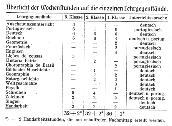 Todavia o fato de 60% do ensino ocorrer ainda em língua alemã é um indicador do objetivo desse grupo étnico de salvaguardar um capital cultural através da instituição escolar. De acordo com Rambo (1994, p.178), a língua alemã “representava o veículo transmissor, por excelência, dos valores e da tradição cultural”. Para Seyfert (1989, p. 141), “a sobrevivência da língua alemã é considerada essencial à própria sobrevivência do Deutschtum (Germanismo), e do próprio grupo étnico teuto-brasileiro”. Disciplinas como Ensino Visual, Geometria, História Bíblica, Geografia, História Natural, História Geral, Canto e Trabalhos Manuais, ministradas em língua alemã, veicularam hábitos e tradições através das artes, da geometria, da religião, da história, da geografia e trabalhos manuais. Os fundamentos do bem cultural denominado germanismo contemplavam diversas áreas do conhecimento, tais como: as artes, o raciocínio abstrato, a memória do tempo, a situação no espaço e os trabalhos manuais, como o artesanato para meninos e meninas.