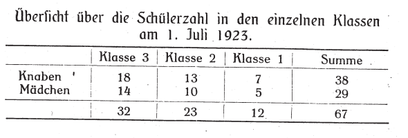 Com o objetivo de apresentar características dos alunos que frequentaram o Collegio Allemão no ano de 1923, analisamos três tabelas, correspondentes ao número total de alunos nas classes únicas em 1923, à nacionalidade dos alunos e ao número total de alunos de 1913 a 1923. Na tabela 3 que contempla a vista geral sobre o número total de alunos nas classes únicas em 1º. de julho de 1923 (Übersicht über die Schülerzahl in den einzelnen Klassen am 1.Juli 1923 ) encontra-se o número total de alunos, divididos por classe e sexo. A terceira classe, que correspondia ao 3º. e 4º. ano, com 32 alunos, sendo 18 meninos e 14 meninas, abrangia 47,7% do total de alunos. Na segunda classe, ou seja, 5º. e 6º. ano, 23 alunos frequentavam as aulas, sendo 13 meninos e 10 meninas, representando 34,3% do total. Na primeira classe, do 7º. e 8º. ano, apenas 12 alunos integravam o corpo discente, sendo 7 alunos e 5 alunas, num escore de 17,9% do total. O maior número de alunos estava concentrado na terceira classe, o menor número de alunos frequentava a primeira classe. A proporção entre meninos e meninas era de 56% para 47%.