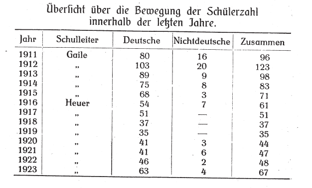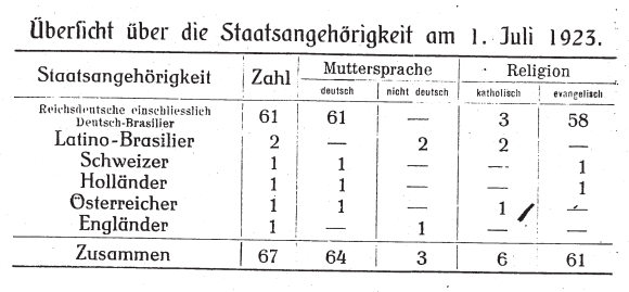 A tabela 4: vista geral sobre a nacionalidade em 1º. de julho de 1923 ( Übersicht über die Staatsangehörigkeit am 1. Juli 1923 ) privilegia três aspectos: a nacionalidade dos pais, a língua falada nas famílias e a religião. Em relação à origem étnica dos pais, 61 crianças eram teuto-brasileiras, duas latino-brasileiras, uma suíça, uma holandesa, uma austríaca e uma inglesa. As crianças teuto-brasileiras constituíam a maioria do corpo discente, atingindo um total de 91%. As demais crianças representavam 9% do total. A respeito da língua materna falada pelas crianças, evidencia-se que 95,5% dos alunos, ou seja, 64 crianças, falavam a língua alemã em casa. Há indícios de que as crianças falassem dialetos alemães em suas famílias, como por exemplo, o pomerano, vindo a aprender a língua alemã padrão, somente no colégio. Das outras crianças, representando 4,5% do total de alunos, uma falava o inglês e duas falavam o português. Sobre a religião dos alunos, 61 crianças eram evangélicas, abrangendo 91% do total. Entre estas crianças, 58 eram teuto-brasileiras, uma suíça e uma holandesa. Em relação às seis crianças católicas, três eram teuto-brasileiras, duas latino-brasileiras e uma austríaca, alcançando 9% do total. A criança inglesa não está inserida em nenhuma das denominações, apesar de estar contada no escore final.