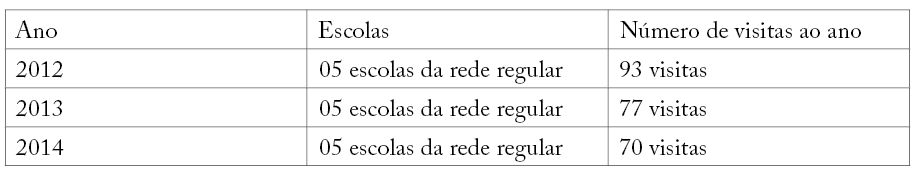 Nesta pesquisa as visitas ocorreram semanalmente, respeitando o funcionamento autônomo das escolas e os imprevistos inerentes do sistema público (greves, reformas), o que implicou no número de visitas realizadas (Quadro 1).