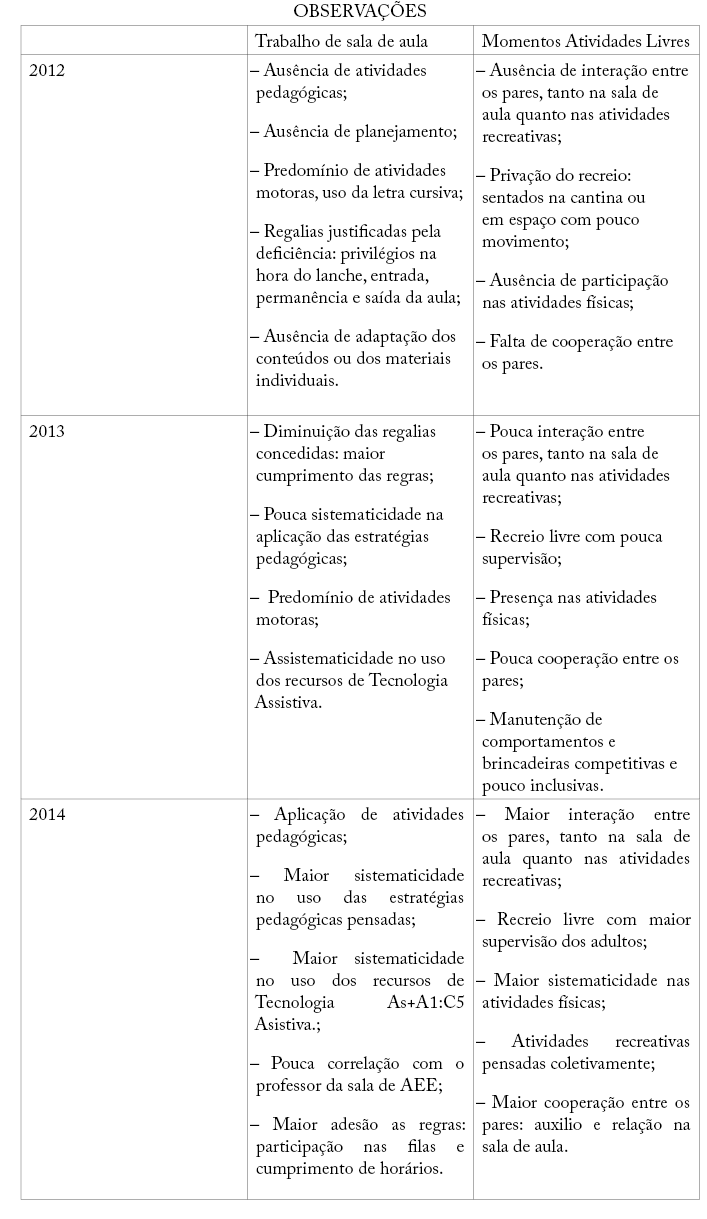 A ida mais sistemática às salas de AEE ocorreu em 2014, mediante a organização das escolas e os acordos realizados com as famílias. Ainda assim, apesar de a priori ser um professor mais instrumentalizado, as práticas centradas na visão médico-positivista eram perpetuadas, o que afastava o aluno de acompanhar o currículo.