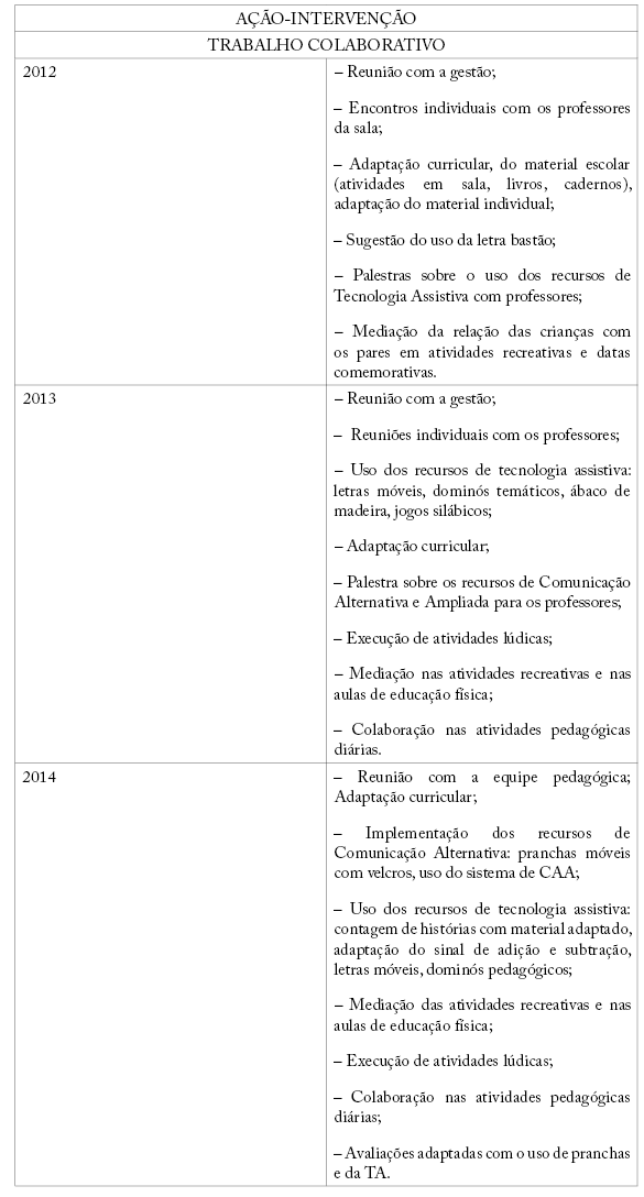 Posteriormente, fazia-se a proposta de um trabalho de colaboração considerando as especificidades do alunado. As ações-intervenções foram alicerçadas nos princípios da Educação Inclusiva e subsidiadas pelos recursos de Tecnologia Assistiva, buscando contribuir para o processo de escolarização dos sujeitos com deficiência.