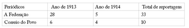 A partir das análises das edições dos anos de 1913 e de 1914 de ambos os jornais identificamos um total de 43 reportagens que abordavam algum aspecto sobre a missão, fossem eles no sentido de anunciar, informar, ou ainda, de argumentar sobre a deliberação do governo gaúcho. No quadro a seguir, apresentamos a distribuição das mesmas por periódicos.