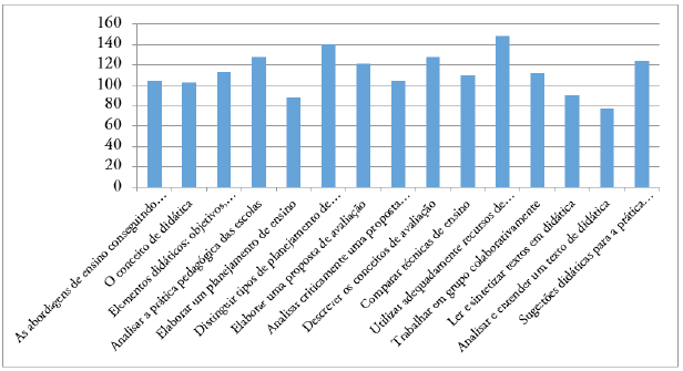 Autoavaliação dos estudantes realizada na disciplina Didática na Ação Docente no Curso de PedagogiaDe acordo com o enunciado da questão, os estudantes assinalaram, em ordem crescente, o item que eles consideraram mais importante e que tinham aprendido mais. Isso significa dizer que eles se sentem mais seguros em determinados conteúdos do que em outros, expressando sua aprendizagem no campo da Didática. Os resultados apontam que o conteúdo mais aprendido refere-se a “utilizar adequadamente recursos de ensino”, ou seja, este item corresponde a um dos objetivos da disciplina e implica também em sua proposta metodológica que, ao trabalhar com recursos de ensino, procura valorizar a unidade teoria e prática por meio de um processo que se dá de forma individual e coletiva, possibilitando, assim, a construção de novas aprendizagens a partir da interação entre os sujeitos desse processo, professor e estudante, vivenciadas na instituição formadora e no campo de atuação, a escola.