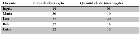 Assim, para uma melhor compreensão e visualização dessa problemática, elaboramos uma tabela que indica a quantidade de horas observadas em cada sala, o pseudônimo das docentes e a quantidade de interrupções que aconteceram durante as observações em sala de aula.