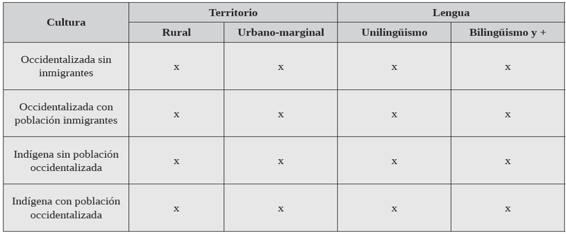Como evidencia de esta complejidad, Ferrada (2015) propone un cuadro muy ilustrativo de escenarios de desempeño (Tabla Nº1). En su propuesta se articulan tres dimensiones (Cultura, Territorio y Lengua) en un contexto de alta vulnerabilidad y pobreza. Así es posible obtener 16 distintos contextos. En este mismo sentido, al referir exclusivamente a lo rural como eje articulador estos no parecen ser menos numerosos o complejos.