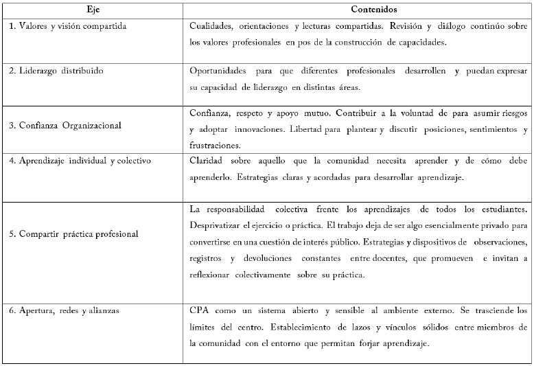 Pero no toda reunión de profesores constituye una comunidad profesional y a pesar de intentos por determinar medidas objetivas comparables ha sido difícil llegar a un acuerdo sobre una base o estándar que permita efectivamente establecer su logro. Lo que si queda en evidencia es que una CPA debe ser visualizada desde una perspectiva multidimensional en la que se incluyen capacidades de organización, personales e interpersonales. En la confección de la tabla Nº2 hemos recogido los aportes de los diversos autores hasta aquí referenciados a fin de determinar preliminarmente aspectos configurativos de una CPA.