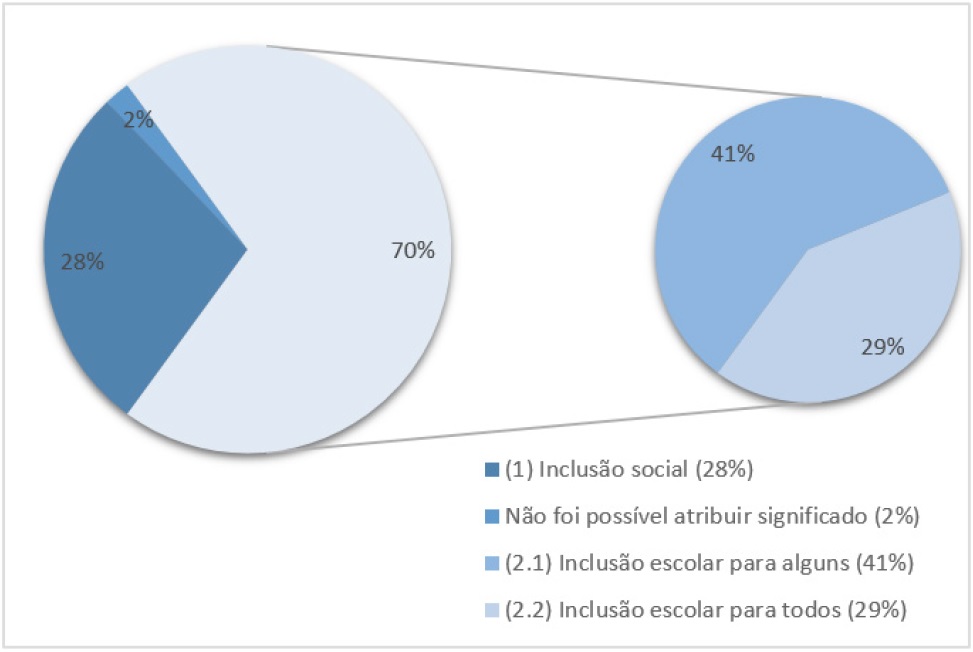 Das 97 narrativas em que analisamos a compreensão que os docentes da Rede Estadual de Educação de São Paulo tinham sobre inclusão, foi possível observar que 28% ou 27 educadores, a relacionaram com a ideia de Inclusão Social (categoria 1). Já 68 narrativas, cerca de 70%, relacionaram esse termo com a ideia de Inclusão Escolar (categoria 2), (Gráfico 1). Cabe relembrar ainda que, em duas narrativas não foi possível extrair a compreensão de inclusão adotada por seus autores, o que corresponde a 2% do total de trabalhos analisados.