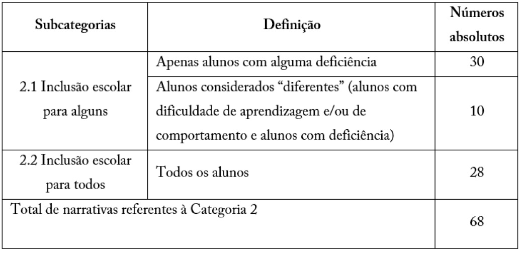 Outro aspecto relevante é que dentre as 68 narrativas da categoria 2, 40 profissionais, ou seja 41%, ainda atribui à inclusão o significado de acesso à educação por alguns alunos (subcategoria 2.1). Uma fala muito comum nessas narrativas é a de que apenas alguns estudantes são diferentes. Há, por exemplo, expressões como: “outras diversidades”, “aquele aluno que é estranho ou peculiar”, ou “aquele aluno que apresenta limitações e dificuldades”, como se todos os demais alunos fossem iguais entre si.