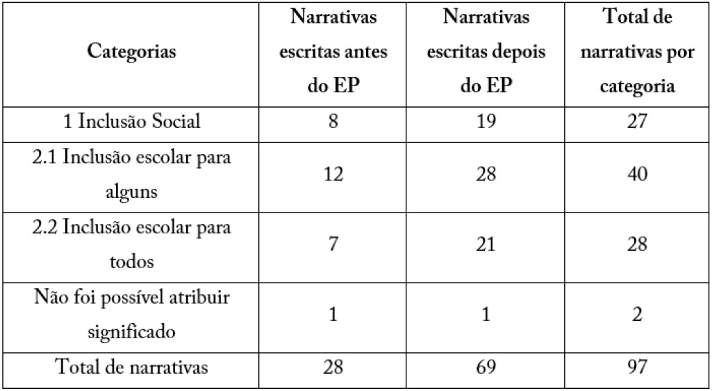Das 97 narrativas, duas não se encaixaram em nenhuma categoria por apresentar definições vagas que não nos permitiram extrair a concepção de inclusão adotada pelos docentes que as escreveram.