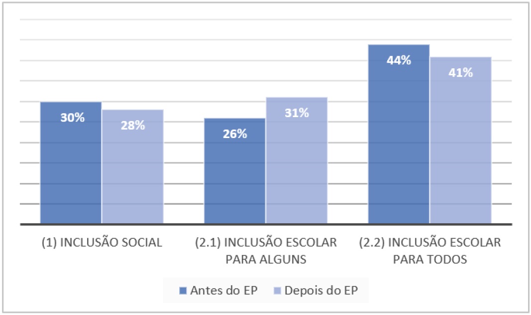 Era de se esperar que dentre essas narrativas houvesse um número menos significativo de profissionais que associassem a ideia de inclusão apenas à pessoa com deficiência, o que não ocorreu. 31% dos cursistas que escreveram a narrativa após o EP ainda afirmavam que a inclusão escolar se restringia ao acesso de alguns alunos à escola regular, mais frequentemente relacionando esses “alguns” aos alunos com deficiência (Gráfico 2).