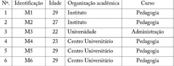 Tal realidade se constituiu de três instituições de educação superior do Distrito Federal, particulares, com seis estudantes jovens (BRASIL, 2013b), sendo uma universidade (1 aluna), um instituto superior de educação (duas alunas) e um centro universitário (três alunas). Essas estudantes foram escolhidas com apoio em informações obtidas por estes autores, antes da pesquisa, por demonstrarem atitude de superar a alienação, bem como a condição de vulneráveis. Portanto, em primeiro lugar, consideraram-se características das participantes (ver Quadro 1), e não das instituições – organização acadêmica ou categoria administrativa – ou dos cursos.