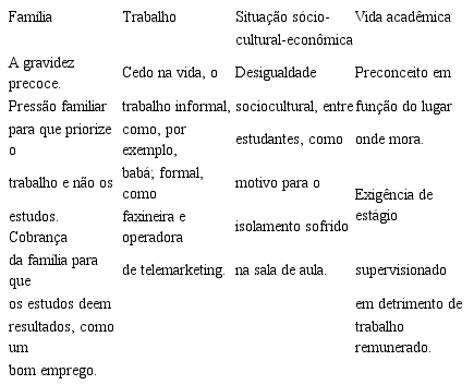 Os problemas enumerados no Quadro 2 parecem se vincular diretamente com a luta pela sobrevivência. Portanto, desenvolvem-se em meio a necessidades imediatas. Na esfera familiar, por exemplo, essas mulheres se apoiam em mães e maridos, embora, inicialmente, tenham sofrido pressão para trabalhar em vez de apoio para estudar. A M5, por exemplo, só conseguiu continuar na educação superior depois de mudar-se para perto da mãe. Outra, ao se comparar com membros da família, reconheceu ser impossível adiar o ingresso e permanência na educação superior, pois “chega uma idade na vida em que não se tem mais ‘pique’ para estudar, nem vontade de estudar” (M6).