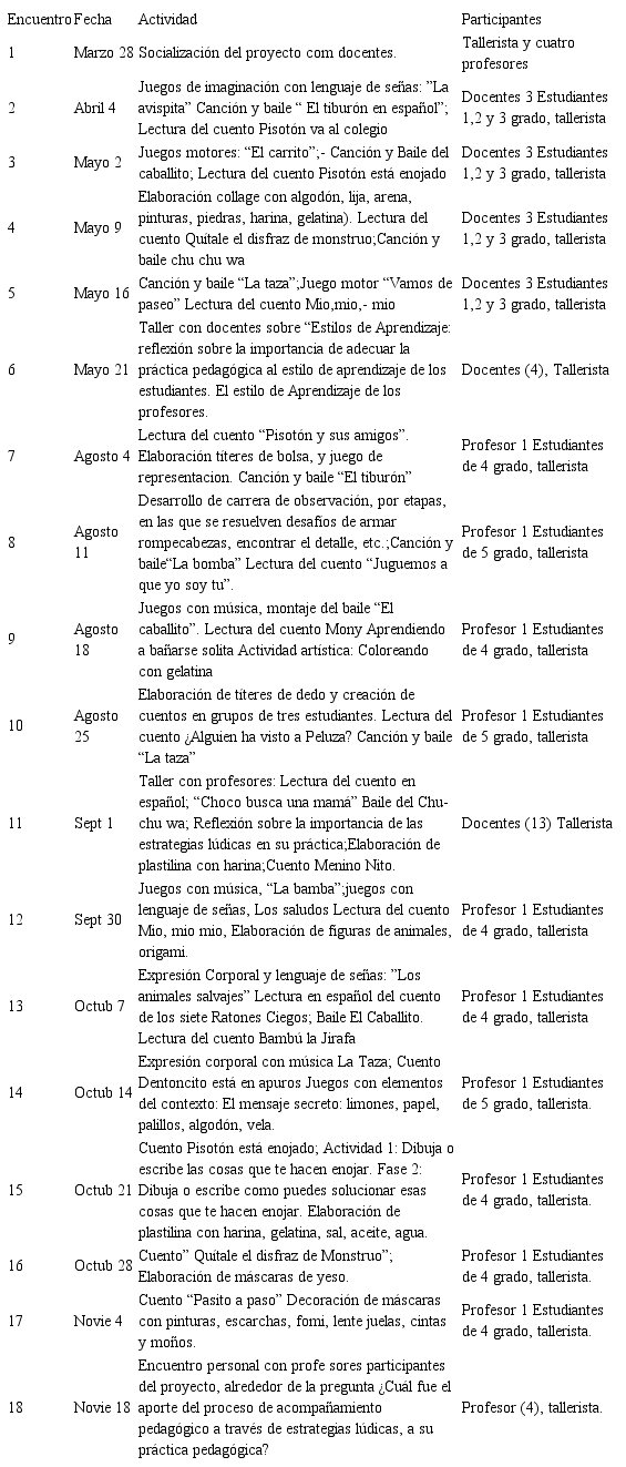 Durante el segundo semestre de 2016, se realizó el encuentro No 11, taller de “Estrategias Lúdico pedagógicas”, en el que participaron 11 docentes de la institución educativa. Las actividades de acompañamiento pedagógico con profesores y estudiantes, en diferentes espacios de la escuela como el aula de clase, salón de audio-visuales y patio salón, tuvieron una intensidad de 60 minutos, una vez por semana, y utilizaron como ejes el juego, la literatura, el movimiento y el arte. El encuentro No 18 corresponde al espacio destinado para entrevistar a los cuatro profesores, participantes del acompañamiento pedagógico, alrededor de la pregunta ¿Cuál fue el aporte del proceso de acompañamiento pedagógico a través de estrategias lúdicas, a su práctica pedagógica?