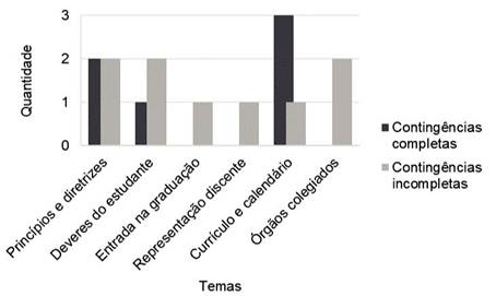 O gráfico 1 mostra os temas nos quais as contingências foram agrupadas, e o número de contingências agrupadas nesse tema, que são: Princípios e diretrizes (quatro contingências), Deveres do estudante (três contingências), Entrada na graduação (uma contingência); Representação discente (uma contingência); Currículo e calendário (quatro contingências) e Órgãos colegiados (duas contingências).
