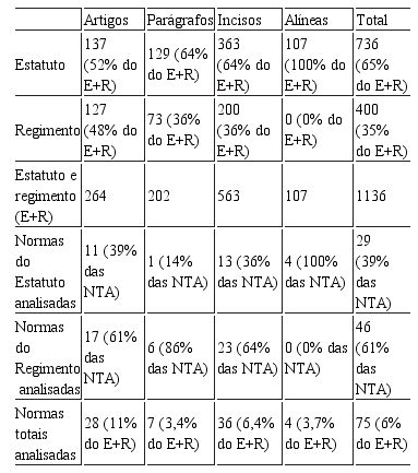 A tabela 2 apresenta a quantidade de normas (artigos, parágrafos, incisos e alíneas) do Estatuto, do Regimento, ou de ambos; indicando a quantidade dessas normas especificamente nos trechos dos documentos que foram analisados para identificação das contingências. Percebe-se, portanto, que 1136 é o número total de normas nos dois documentos; normas referentes a ensino na graduação, que foram as analisadas, são 75, representando 6% do total (Estatuto e Regimento). 46 (61%) das normas analisadas estão no regimento, embora o Estatuto contenha no total mais normas que o regimento (736 no Estatuto e 400 no regimento).