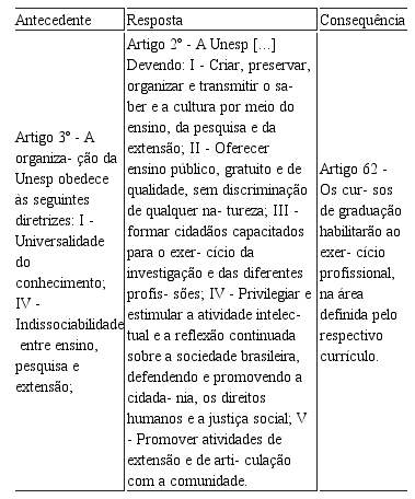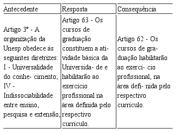 Apesar disso, a contingências tecnológicas, ilustradas nas tabelas 3 e 4, servem como bom exemplo de contingências que articulam respostas com demandas dos estudantes e da própria sociedade, sintetizadas no artigo 62 que se referem à capacidade dos cursos de graduação de habilitarem os estudantes ao exercício profissional. Quando articulado na contingência da tabela 3, que consiste também numa contingência positiva, esse artigo apresenta uma consequência tecnológica para o cumprimento de uma resposta coerente com missão organizacional da instituição, com clara função social (Artigo 2º). Quando articulado na contingência da tabela 3, caracterizada como tecnológica negativa, ela resulta em ambiguidade pela falta de especificidade na resposta exigida.