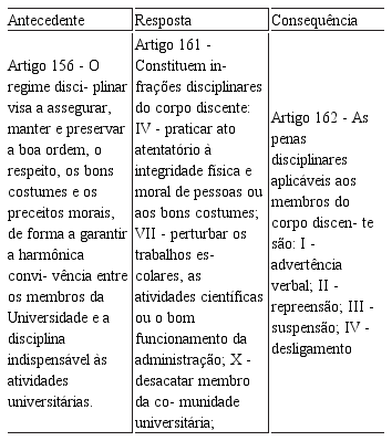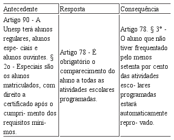O desequilíbrio na quantidade de termos (tabela 1) explica parcialmente a falta de contingências completas. A maior quantidade de respostas seguida de um número baixo de consequências, na maior parte arbitrárias, pode resultar em um texto normativo de baixa efetividade, como argumentaram Todorov et al. (2004) no trabalho com as normas do Estatuto da criança e do adolescente. Os resultados parecem mostrar que o texto carece de consequências que poderiam melhor definir a função das contingências, o que indica ausência parcial de planejamento de comportamentos educativos, no sentido de que se espera que os estudantes, ou a universidade, realizem algumas ações, mas não se define com precisão, ou às vezes nem se define, o contexto no qual elas devem ocorrer, ou as implicações de sua ocorrência.