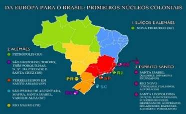 Os primeiros núcleos coloniais foram criados pelos suíços e alemães, nos estados do Rio de Janeiro (Nova Friburgo e Petrópolis), Rio Grande do Sul (São Leopoldo, Torres, Três Forquilhas, Nossa Senhora da Piedade e Santa Cruz), São Paulo (Perelheiros, em Santo Amaro, conhecida como Colônia Velha), Santa Catarina (São Pedro de Alcântara, Mafra, Santa Isabel e Vargem Alta), Paraná (Rio Negro) e Espírito Santo (Santa Leopoldina e Santa Isabel) (DIEGUES JÚNIOR, 1964).