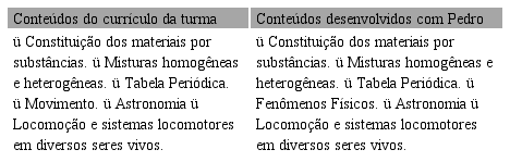 Dessa forma, para tentar atender a todos, algumas das atividades implementadas com o Pedro eram diferentes daquelas dos demais alunos do 7° ano. Entretanto, na medida do possível, o professor de ciências tinha o cuidado de planejar as atividades de Pedro com o mesmo conteúdo que a turma estava estudando, conforme observado no quadro a seguir: