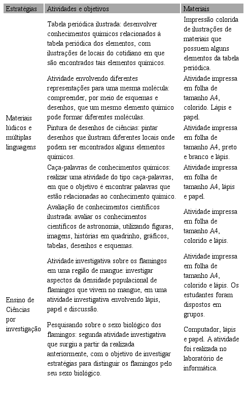 Os conteúdos apresentados no quadro anterior foram desenvolvidos com a turma por meio da utilização de diversas estratégias didáticas, que acabaram contemplando às necessidades de Pedro e dos demais estudantes. As aulas de ciências foram ministradas quatro vezes por semana. O quadro a seguir, demonstra as principais estratégias pedagógicas utilizadas pelo professor de ciências para abordar os conteúdos indicados anteriormente, os seus objetivos e os materiais utilizados para implementá-los: