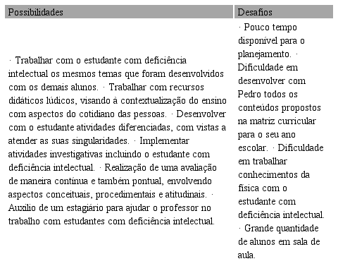 O relatório da professora de apoio e acompanhamento à inclusão de Pedro atesta que o estudante é alfabetizado e necessita de intervenções pedagógicas adequadas. Esse documento serviu como base para as primeiras intervenções pedagógicas do professor de ciências no início do ano. O trabalho, realizado no período de fevereiro a agosto de 2018, evidenciou algumas possibilidades relativas ao ensino de ciências para o Pedro e os demais estudantes. Além disso, foram também destacados alguns desafios enfrentados pelo professor em função das dificuldades de ensinar ciências para um estudante com a condição de Pedro. O quadro a seguir (quadro 3) sintetiza as principais possibilidades e desafios percebidos por meio da prática analisada na pesquisa.