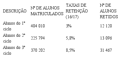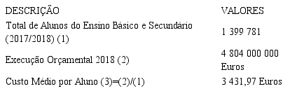 O Quadro 6 apresenta um custo médio por aluno tendo em conta a execução orçamental do Estado português e o total de alunos matriculados no ano letivo de 2017/2018. No Quadro 7 são indicados os valores relativos aos alunos por ciclo, respetivas taxas de retenção e alunos retidos.