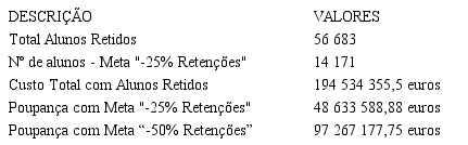 A partir dos quadros acima e triangulando com a meta pretendida de redução em 25% e 50% do número de retenções, até 2018 e 2020, respetivamente, segundo o “Programa Promoção do Sucesso Escolar”, obteve-se um valor que se pode considerar poder desonerar o orçamento do Ministério da Educação em cerca de 48 milhões de euros assumindo uma quebra de 25% nas retenções, fixando-se em quase 100 milhões de euros se for alcançada uma quebra de 50% nas retenções, conforme se pode observar no Quadro 8.