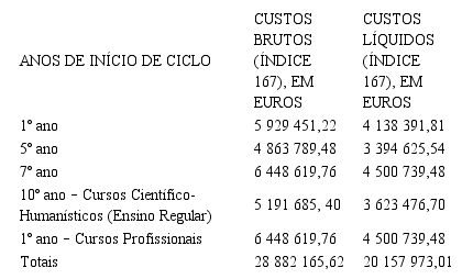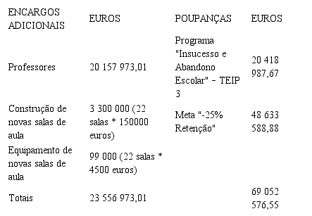 Os valores apresentados evidenciam que o custo real para o Estado português é significativamente menor daquele que se poderia esperar a priori, na medida em que, a eliminação das despesas com programas de combate ao abandono e insucesso escolares e as referentes à retenção dos alunos, permitiria uma poupança na ordem dos 69 milhões de euros.