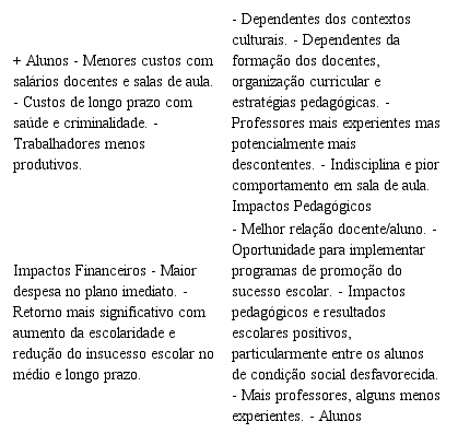No entanto, afastar desde logo aquela medida em função dos encargos financeiros que pode vir a acarretar seria negligenciar um conjunto de efeitos positivos no curto, médio e longo prazo. No curto prazo, é esquecer os efeitos pedagógicos possíveis com resultados no sucesso escolar diminuindo, assim, os encargos com as repetências e, por outro lado, no médio e longo prazo, é negligenciar o efeito spill over de uma população mais educada e, finalmente (ainda que muitos outros efeitos positivos possam ser identificados) é assumir que mais um professor ou mais um funcionário constituirá uma despesa acrescida para o Estado ao invés de ser perspetivado como um investimento. Para além disso, essa despesa é, comumente, sobrevalorizada, tal como pretendemos de seguida demonstrar.