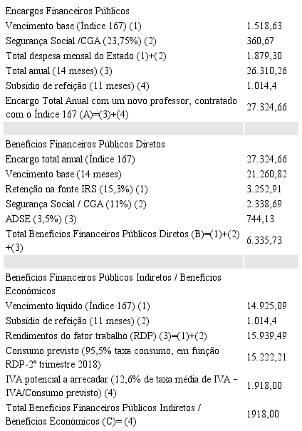 Tendo em conta o enquadramento teórico e metodológico, são apresentados de seguida os custos brutos e líquidos de uma nova contratação docente no sistema educativo português a preços de 2017/2018, para além das possíveis poupanças resultantes da diminuição da retenção de alunos entre o 1º ciclo e o 3º ciclo do ensino básico (ensino fundamental), bem como as que resultariam da cessação dos programas de promoção do sucesso escolar.