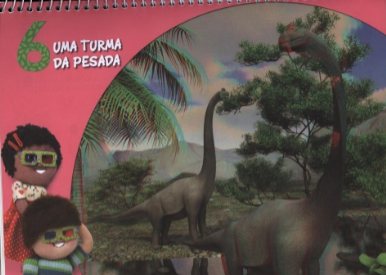 A ilustração se apresenta com o título “Uma turma da pesada” (em cor branca), ao lado do número “6” (colorido e texturado por folhinhas verdes, em contraste com o magenta ao fundo). A criança, que ainda não lê, certamente perguntará à professora o que está escrito ali. Imaginamos então a explicação docente... “a turma dos dinossauros era bem pesada!”... Trabalhoso será recuperar e explicar a antiga gíria, “da pesada”, uma vez que pouco se usa atualmente. De qualquer modo, os símbolos linguísticos são lançados, onde os olhos em geral se fixam primeiramente, tal como fazemos ao ler um jornal. Todo acesso a textos por parte das crianças não alfabetizadas tem valor pedagógico e de letramento, muito embora semioticamente se trate de signos que apresentam degeneração, ou seja, perda de referencialidade.