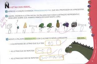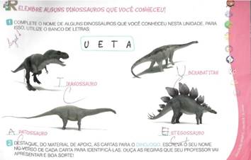 Retomando a unidade 6 – “Uma Turma da Pesada”, verificamos que a primeira sequência (subunidade) apresenta 10 exercícios sobre a temática, dos quais analisaremos mais detidamente os 3 primeiros (figura 2); a segunda apresenta o conceito de fóssil e pegadas; a terceira retoma a aquisição de letras e insere a ideia de impressão da mão (contorno), relacionando-se isto à concepção anterior de pegada; a quarta apresenta o tema musical Fósseis, 14º movimento da peça “O carnaval dos animais”, de Camille Saint-Saëns (1886), propondo a escrita espontânea, apreciação da linguagem musical e o desenho; a quinta enuncia o tema paleontólogo, bem como propõe construção de objetos com sucata e uma brincadeira; a sexta enfoca os tipos de dinossauros, colagem de adesivos (retirados do material de apoio) com imagens dos répteis gigantes, votação da turma pelo animal mais popular, foco na quantidade de letras dos nomes dos dinossauros e, em seguida, nos nomes das crianças reunidas em grupo, além de localização de letras em um alfabeto; a sétima “aula” reflete sobre fósseis encontrados no Brasil, recorrendo ao material de apoio novamente, propõe-se também um desenho que conte como seria se a criança encontrasse ossos de dinossauro em um terreno e socialização das soluções; a oitava retoma os nomes aprendidos de dinossauro, reforçando a aquisição de letras, apresentando um jogo de cartas – o dinojogo – com escrita de palavras, propondo conclusivamente um desenho sobre o dinossauro predileto e a socialização dos resultados.