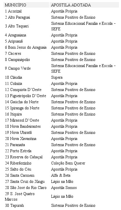 Podemos observar que o Sistema Positivo de Ensino fora adquirido por 33,3% das prefeituras do estado de Mato Grosso, perdendo apenas para as apostilas próprias – materiais elaborados por docentes das redes municipais, um modo de baixar os custos de aquisição. Tendo em vista a liderança de mercado daquele sistema apostilado também em diversos outros entes federados, escolhemo-lo para uma análise que será apresentada na etapa final do presente trabalho.