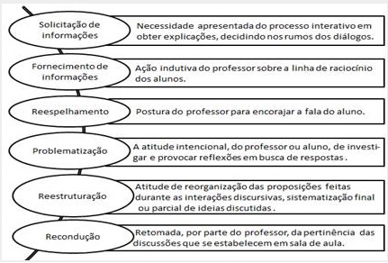 Ao tentar compreender as dimensões das interações que ocorrem entre professores e alunos, encontramos em Monteiro e Teixeira (2004) e Compiani (1996), análises concisas das interações gerais que acontecem durante o processo discursivo em sala de aula. A elaboração de categorias permite compreender melhor o papel da fala dos alunos e do professor. São identificadas pelos autores como: Solicitação de Informações, Fornecimento de Informações, Reespelhamento, Problematização, Reestruturação e Recondução (Figura 1).