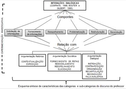 Finalmente, Bouter e Gilbert (1995) categorizam a fala do professor a partir de um terceiro tipo de discurso docente. Para esses autores, a categoria argumentação dialógica destaca-se como sendo as atitudes do professor que incentivam e regulam o compartilhamento de ideias envolvidas no processo de ensino e de aprendizagem, a partir da confrontação de opiniões expostas por todos os envolvidos.
