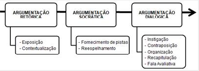 Corroborando a assertiva de Boulter e Gilbert (1995), na argumentação retórica o pensamento e a opinião dos ouvintes não são levados em consideração; apresenta uma estrutura linear onde o professor busca persuadir uma audiência receptiva a transmissão do conteúdo. No cenário de argumentação socrática, o tipo de discurso dirigido é conduzido pelo professor, reformulando questões para obter respostas esperadas pelos alunos. Na argumentação dialógica, o professor se propõe a construir consensos, para que os alunos possam discutir e criar questões investigativas.