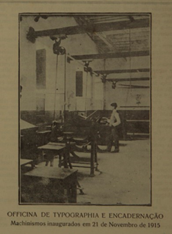 Pode-se perceber pelo exposto no quadro acima, que no Ceará, no primeiro ano de funcionamento da escola, apenas as oficinas de tipografia e encadernação entrou em funcionamento, fato que se deveu aos escassos recursos financeiros. Segundo o mesmo Almanaque (1922, p. 670), apenas em 1913 foram postos em funcionamento maquinários que já se encontravam na instituição há cerca de três anos, visto que não havia orçamento suficiente para sua montagem e uso. Em 20 de novembro de 1915, foram inauguradas máquinas a vapor em todas as seções da instituição, como ilustrado na Figura 1. Assim a oficina de tipografia, sapataria, ferraria, serralheria, carpintaria e marcenaria passaram a ser movidas por “modernos machinismos a vapor” (ALMANACH..., 1918, p. 125).