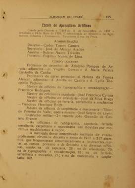 Treze alunos, apenas, até hoje, concluíram o curso integral deste instituto, sendo 2 da oficina de Alfaiataria: Francisco de Assis e Silva e José Gonçalves; 2 da oficina de Tipografia e Encadernação: Alfredo Faustino e Octávio Cavalcante Bastos; 5 da oficina de Marcenaria e Carpintaria: Manoel Soares da Silva, Francisco Cavalcante Costa, Raymundo Lopes Carneiro, José Gonçalves Ramos e Walfrido de Souza; e 4 da oficina de Ferraria, Serralheria e Mecânica: Francisco Enrich Filho, Raymundo Felippe, Raymundo de Castro Cunha e Francisco Soares da Costa (ALMANACH..., 1922, p. 672).